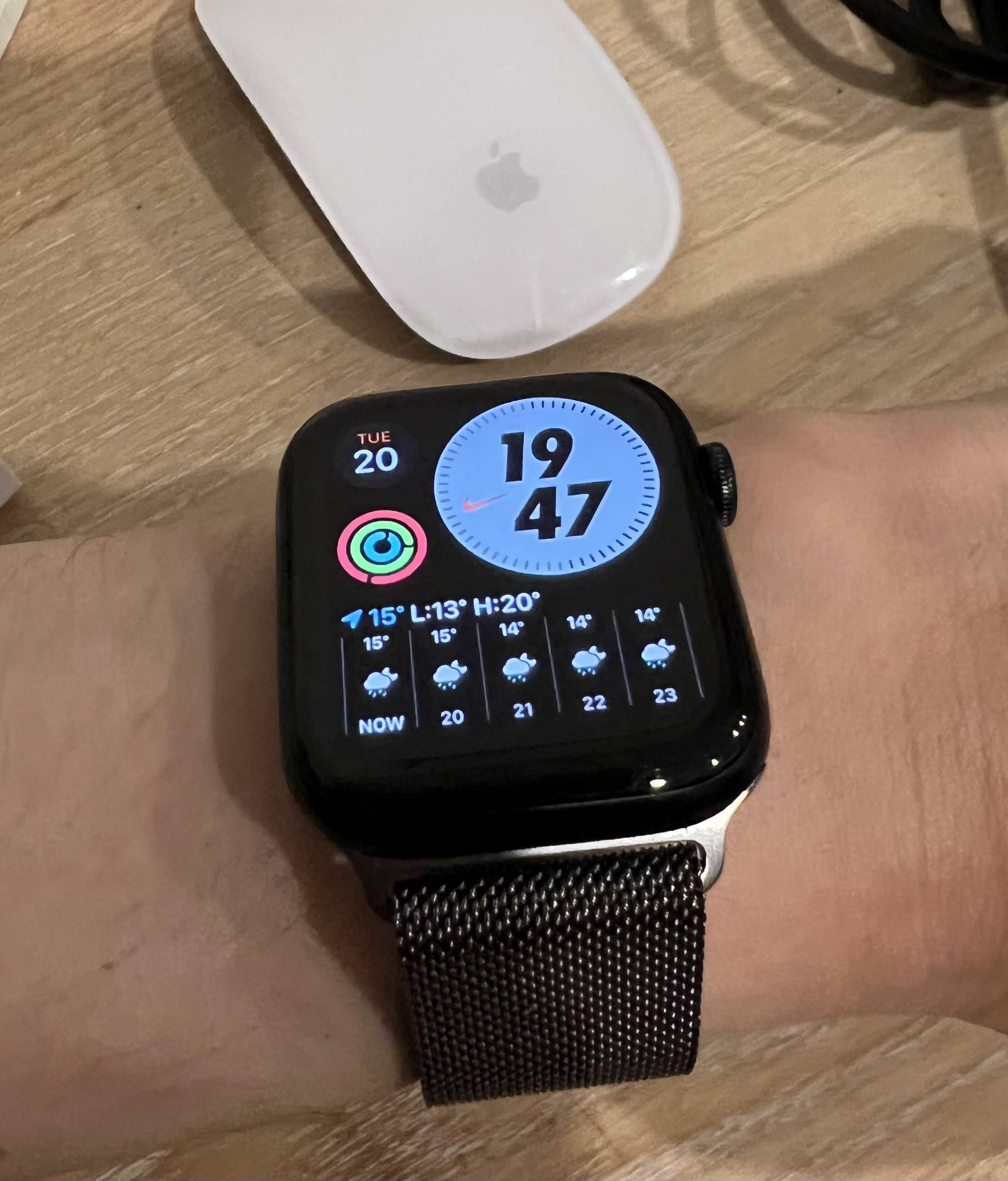 直接上图. 7年过去了, Apple Watch的表带居然还能做到向后兼容. 实在是厉害. 表壳倒是除了银色之外有了不同颜色, 可惜当年奢侈至极的黄金Apple Watch没有了. 7年前的Apple Watch第一代是蓝色的Sports loop, 颜色我还是很喜欢的. 不知道Apple咋想的, 把蓝色的表带给停了, 剩下的一堆粉色、黑色、彩虹色没有一个我喜欢的, 只能忍痛舍弃, 然后加了100刀, 买了一条Apple Watch第一代的时候就有的milanese金属表带. 黑色表带配黑色表壳, 属于流行的dark theme, 还挺好看的. milanese金属表带虽然完全通过磁铁来吸住, 不过还挺坚固的, 戴在手腕上也非常舒服, 也不是很重. 没发现啥缺点. 虽然7年过去了, 苹果又研发了很多花里胡哨的表带, 譬如那个braided solo loop. 但是milanese依然不落伍. 但唯一的缺点就是夹头发. 千万别让表带碰到头发, 否则就是拔毛神器.