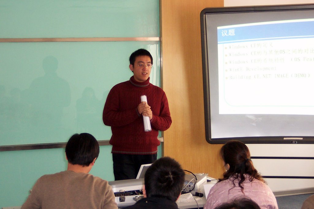 讲课分两部分,一部分是在同济软件学院上课,当时Windows CE这么火,万院长果断在学校开了这门课,找不到老师,就让我去讲课。让硕士生讲课其实这是违规的,完全是因为万院长的魄力,这点我十分敬佩他。还有就是企业邀请我讲课。因为那本书的关系,很多企业邀请我到他们公司去培训他们的工程师,当时我感觉可牛了,还有媒体来采访我,《程序员》杂志来招我约稿,还有什么C++20年周年纪念大会都请我去发言。所以当时自己一度飘飘然,觉得是国内知名人物了。现在看看太傻太天真。下图是我2006年接受一个公司的邀请,去给他们培训拍的照片。
